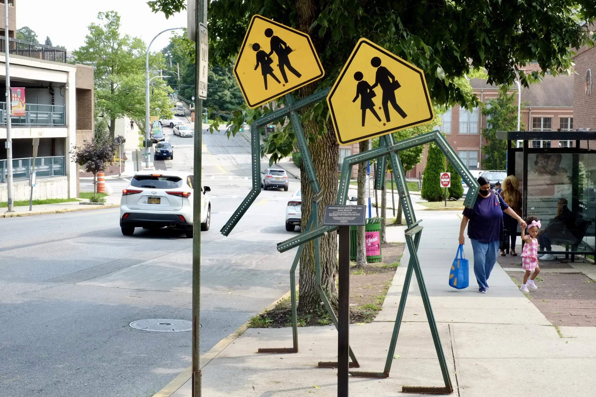 Created by Brooklyn-based artist Leon Reid IV, Pedestrian Shuffle brings humor and energy to everyday street signage by animating the common gesture of crosswalk signs. This playful sculpture invites viewers to connect more personally with their urban surroundings. Known for his street art and public installations in cities around the world, Reid IV's work spans traditional exhibitions and large-scale projects.